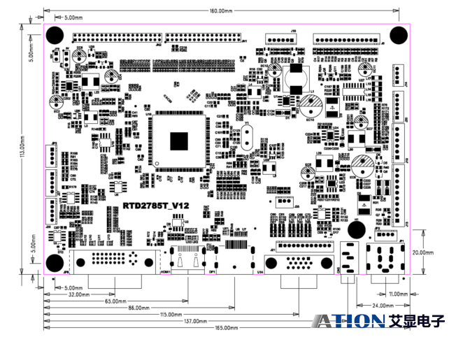 本驱动板主要是配接TFT LCD PANEL,采用主芯片是RTD2785,该芯片内置模拟RGB输入、HDMI1.4b输入接口、DP1.2数字信号接口、DVI数字接口。输入可达2560x1600@60Hz,2560x2048@50Hz。支持4路LVDS输出。
